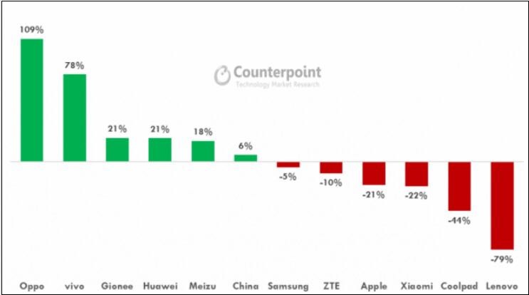 在智能手机年度出货量增长方面,实现增长的排名前五位的手机品牌全是国产品牌,包括Oppo,Vivo,金立,华为和魅族,其中Oppo增长高达109%,Vivo增长78%。五大品牌相加的市场份额占比达58%。而三星、中兴、苹果、小米、酷派和联想手机出货量增速下滑,其中苹果手机出货量下滑21%,小米下滑22%,联想下滑幅度接近80%。