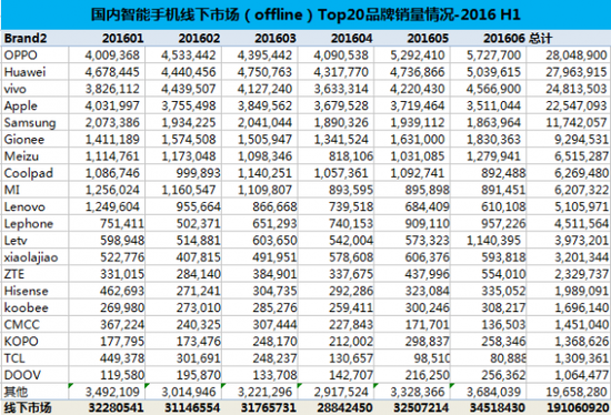 其中,线下市场前五名分别是OPPO、华为、vivo、Apple和三星,销售量分别为2804万、2796万、2481万、2254万和1174万。