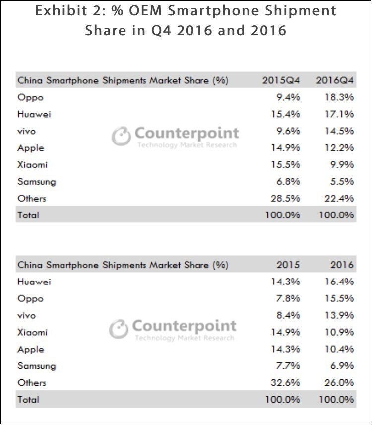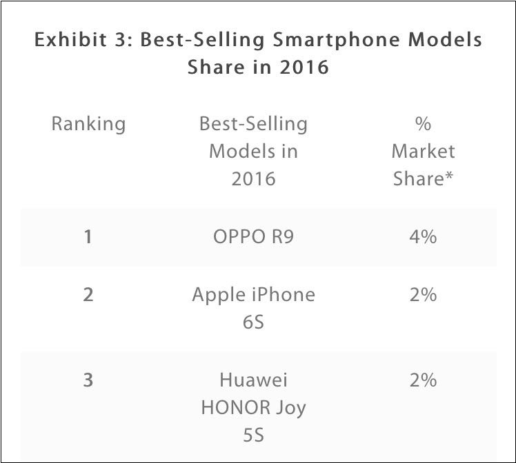 根据研究机构Counterpoint上周末发布的调研报告,在2016年最畅销机型排行榜中,苹果iPhone 6S所占市场份额仅2%,排名第一的是Oppo R9,市场占有率达4%。这也是自2012年以来,苹果iPhone首次跌出最畅销机型榜首。