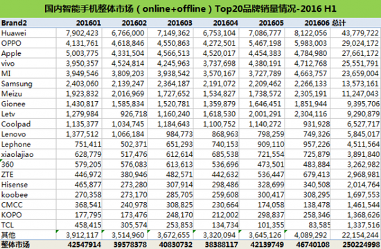 赛诺还发布了国内智能手机线下市场的统计数据。据统计,2016年上半年,线下市场整体销量为1.91亿。