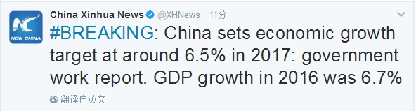 新华社英文网,中国2017年GDP增长预期目标为6.5%左右或以上,维持2017年财政赤字率在3%,CPI涨幅料为3%左右,M2约为12%。