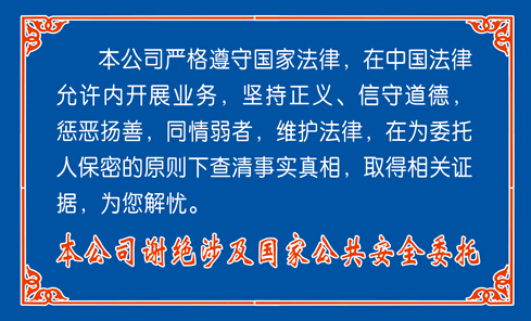 很多行业规范都是参照我们的原则来制定的。我们对委托客户的相关信息资料严加保密,专人专管,不与任何无关人员(包括本公司人员)透露,确保委托人的隐私性、安全性。此外,我们还与一些律师事务所、法律援助机构合作,在搜集取证上全力做到“有的放矢、精准精确”,保证所采集的证据能发挥最大效应。