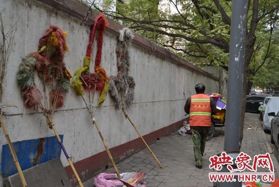 2日上午9时许,郑州文化宫路与颖河南里路口东约100多米路南环卫工师傅的休息点,临近休息点旁边小区院墙上,摆放着3把经过改良加长、加宽酷似“蝙蝠形”扫帚。距离休息点不远路北看见一名环卫工师傅正在清扫路边的飘落的干树叶,手中使用的独特别具一格的“蝙蝠形”镂空扫帚。