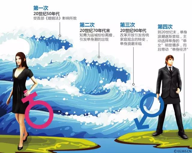 资料显示,中国内地曾经出现过几次单身潮。第一次是在20世纪50年代,首部《婚姻法》带来了全国的离婚潮;20世纪70年代末,知青为了返城纷纷离婚,引发了第二次单身潮的出现;20世纪90年代以来,改革开放引发传统家庭观念的转变,第三次单身浪潮来临;到现在,随着经济的飞速发展和女性自主意识的提升,第四次单身浪潮逐渐显现。