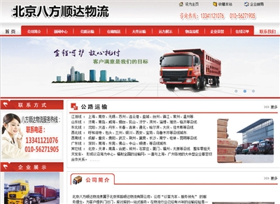 由于时间紧急,平常联络的物流公司暂时没车,配送不了。当天,该公司的行政人员从网络上搜索武汉到北京的物流专线,发现一家名为“八方顺达物流”的公司,红色主页的网站上,显示有客服电话、物流、接单、登记、调用安排、在途追踪等具体信息。