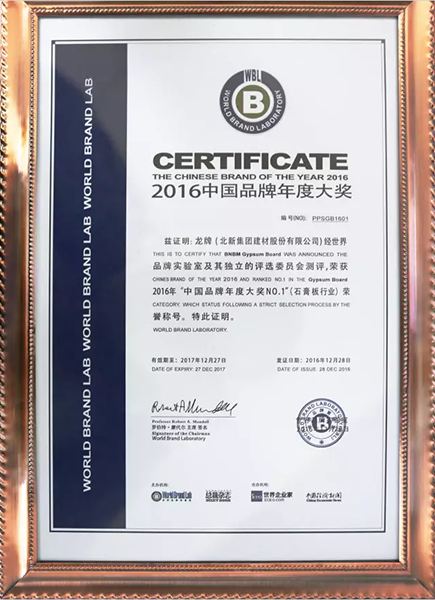 由世界品牌实验室主办的2016年(第十三届)“中国品牌年度大奖”排行榜揭晓。北新建材、华为技术、中国国航、北汽集团、海尔、苏宁等35个中国各行业领军品牌当选“中国品牌年度大奖”。北新建材“龙牌”荣膺石膏板行业2016年“中国品牌年度大奖NO.1”称号。